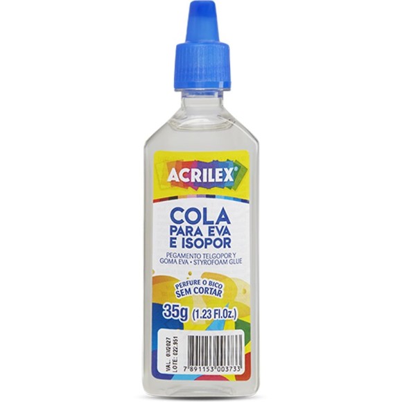 Cola para EVA e Isopor 35g da Acrilex é prática e eficiente para trabalhos de artesanato e escola, oferecendo fixação precisa em materiais como E.V.A. e isopor. Seu bico aplicador exclusivo garante maior controle no uso, tornando a aplicação mais fácil e econômica. Com secagem ao ar em até 12 horas, é solúvel em álcool e não é resistente a lavagens, sendo indicada especialmente para trabalhos manuais, projetos decorativos e escolares.
