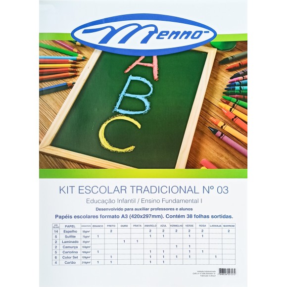 O Kit Escolar Tradicional N3 da Menno é a escolha perfeita para professores e alunos que buscam materiais de qualidade para as atividades escolares. Desenvolvido especialmente para auxiliar na Educação Infantil e Ensino Fundamental I, este kit oferece uma seleção de papéis no tamanho A3, ideal para projetos criativos e educativos.