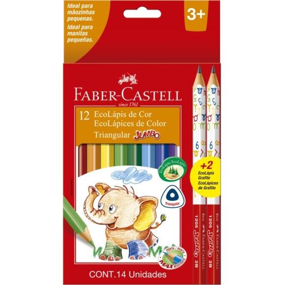 Lápis de Cor 12 Cores Jumbo Triangular + 2 Lápis Grafite Jumbo Faber Castell