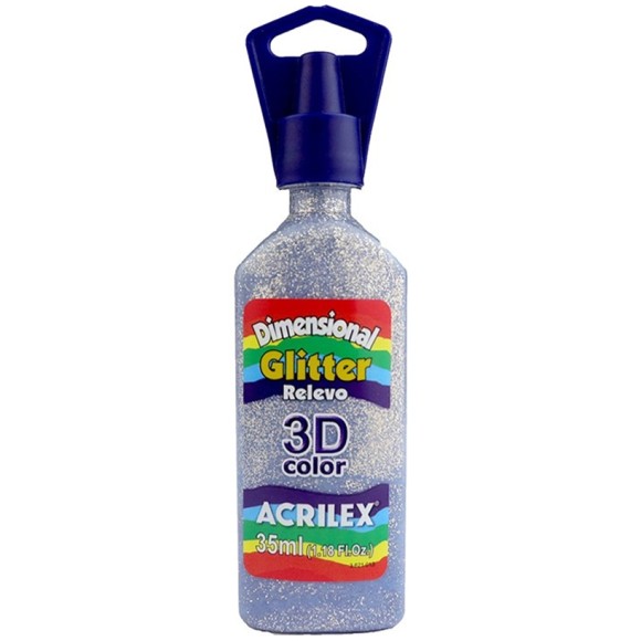 A Tinta Dimensional 3D Relevo Glitter Prata 35ml da Acrilex é ideal para ser utilizada em qualquer tipo de material poroso e aderente, como tecidos de algodão, madeira, cerâmica, gesso, papel, papelão, isopor.